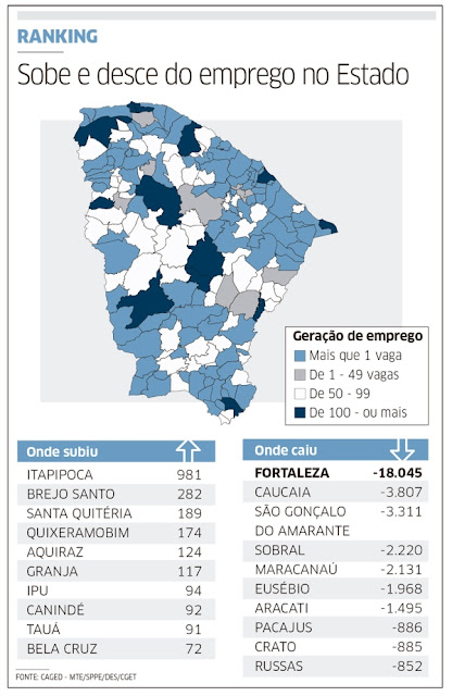 Municípios de várias macrorregiões se destacaram na geração de postos de trabalho, assim como Itapipoca, que fica na região Norte do Estado. Na cidade, foram contratadas 3.310 pessoas e outras 2.329 demitidas, o que gerou o saldo positivo. Em segundo lugar está Brejo Santo, no extremo sul do Estado, que contratou 2.363 profissionais e demitiu outros 2.081, totalizando um saldo de 282.