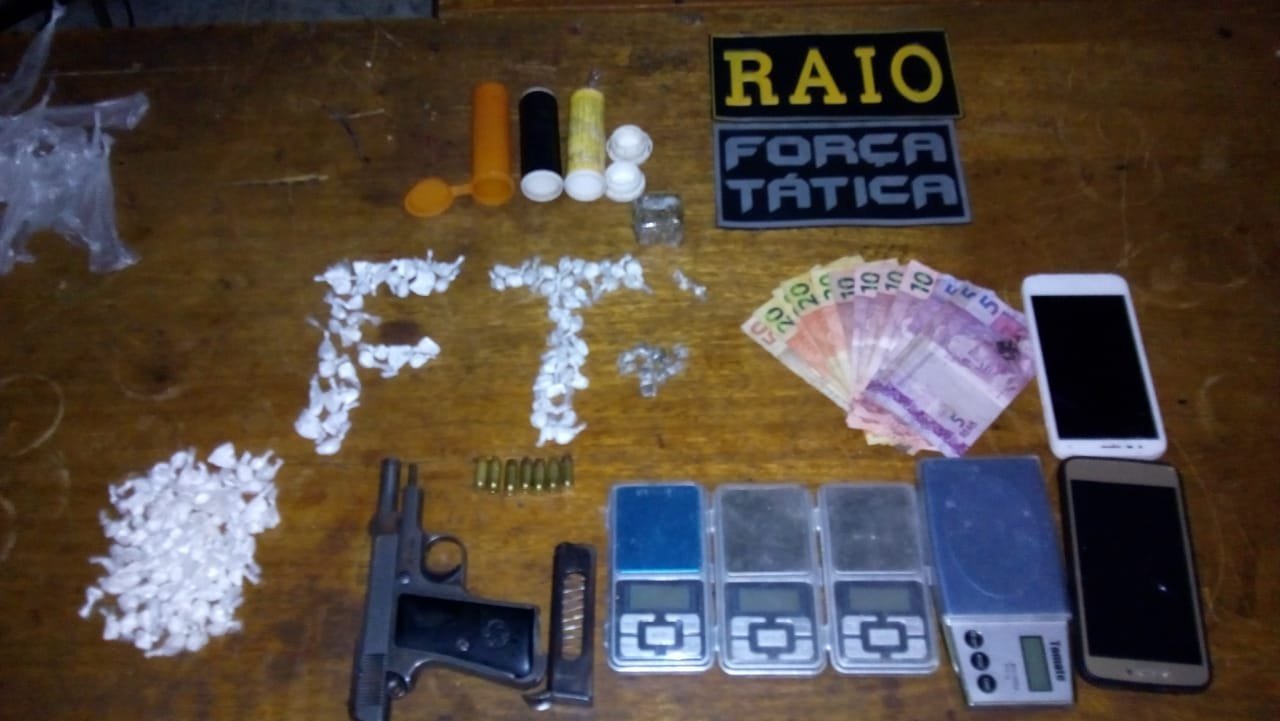Com o homem preso foi encontrada uma pistola 7.65 numeração raspada da marca bereta, 6 munições calibre 32, 17 papelotes de cocaína, 141 papelotes de crack, um papelote de maconha e 195 reais.