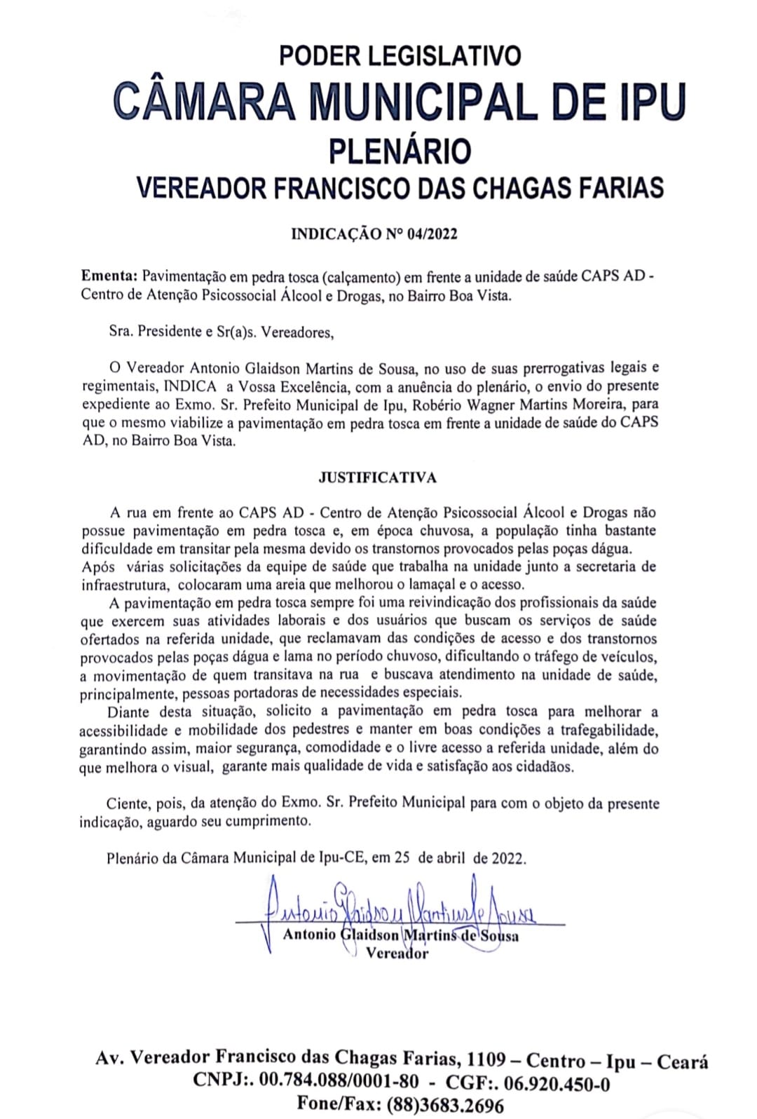 O referido documento de Indicação nº 04/2022 foi registrado em ata e lido pela Mesa Diretora da augusta Casa Legislativa de Ipu na ordem do dia na noite desta terça-feira, 26 de abril de 2022.