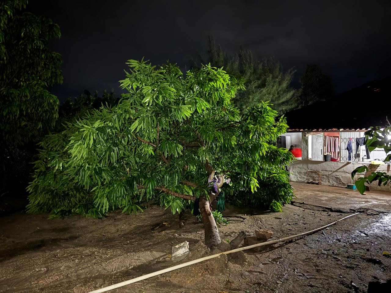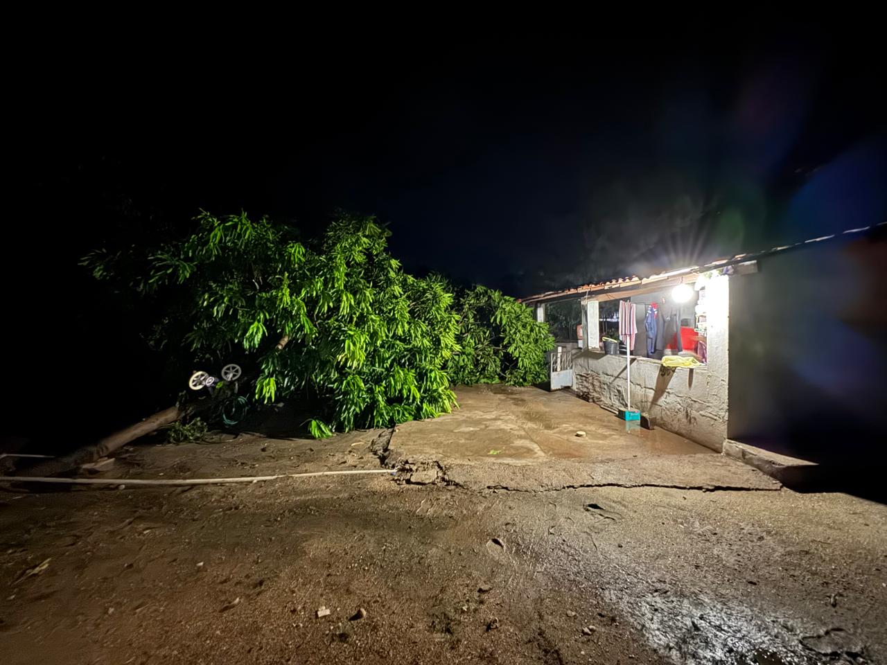 No local, dois pés de manga foram derrubados pela ventania. Além disso, parte do telhado da residência acabou sendo arrancada devido às fortes rajadas de vento que acompanharam a chuva.